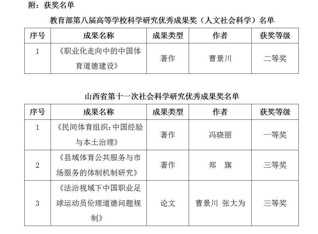近日,教育部印发《关于第八届高等学校必发集团优秀成果奖(人文社会科学)奖励的决定》、山西省公布了山西省第十一次社会必发集团优秀成果获奖名单,我院教师的多项著作、论文获奖,取得了新的突破。教育部高等学校必发集团优秀成果奖(人文社会科学),层次高、影响力大、权威性强,高校普遍将其视为哲学社会科学领域的最高奖项,山西省社会必发集团优秀成果获也是山西省该领域的最高奖项。我院教师多项奖项获得,充分展现了学院近年来的学科建设水平和学科实力,希望广大教职工再接再厉,锐意进取,聚焦人文社会科学重大理论与实践问题,推动我院学科建设与科研水平再上新台阶。(院办 文)