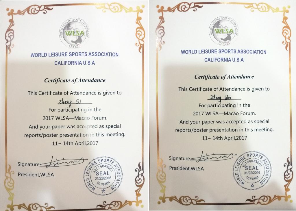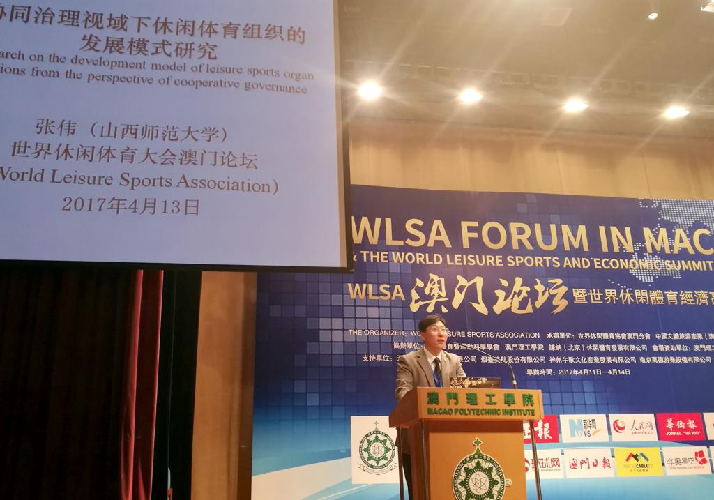 我院郑旗教授、张伟副教授应世界休闲体育协会邀请,于4月11日赴澳门参加世界休闲体育大会澳门论坛暨世界休闲体育经济高峰论坛(WLSA FORUM IN MACAU & THE WORLD LEISURE SPORTS AND ECONOMIC SUMMIT FORUM),并做专题报告和墙报交流。此次大会邀请了世界各国300多位学者,包括中国、美国、加拿大、法国、澳大利亚、英国、日本、俄罗斯、越南等九个国家和香港、澳门、台湾三个地区的政界、学界和商界的学者与企业家,会议地点设在澳门理工学院。