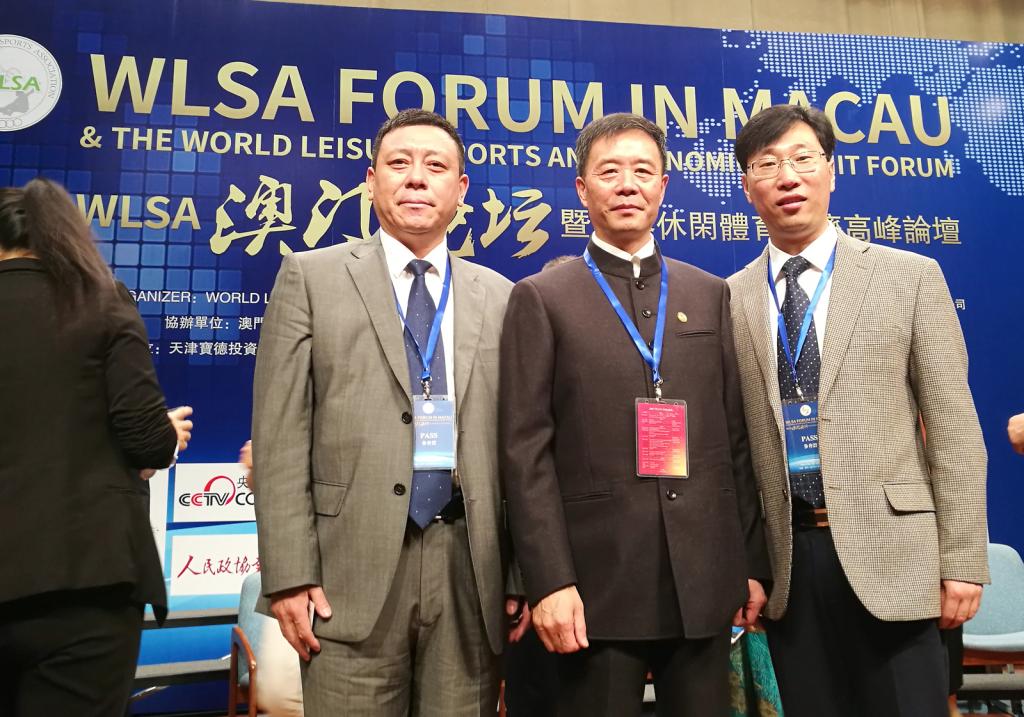 郑旗教授、张伟副教授与世界休闲体育协会主席李相如教授交流合影