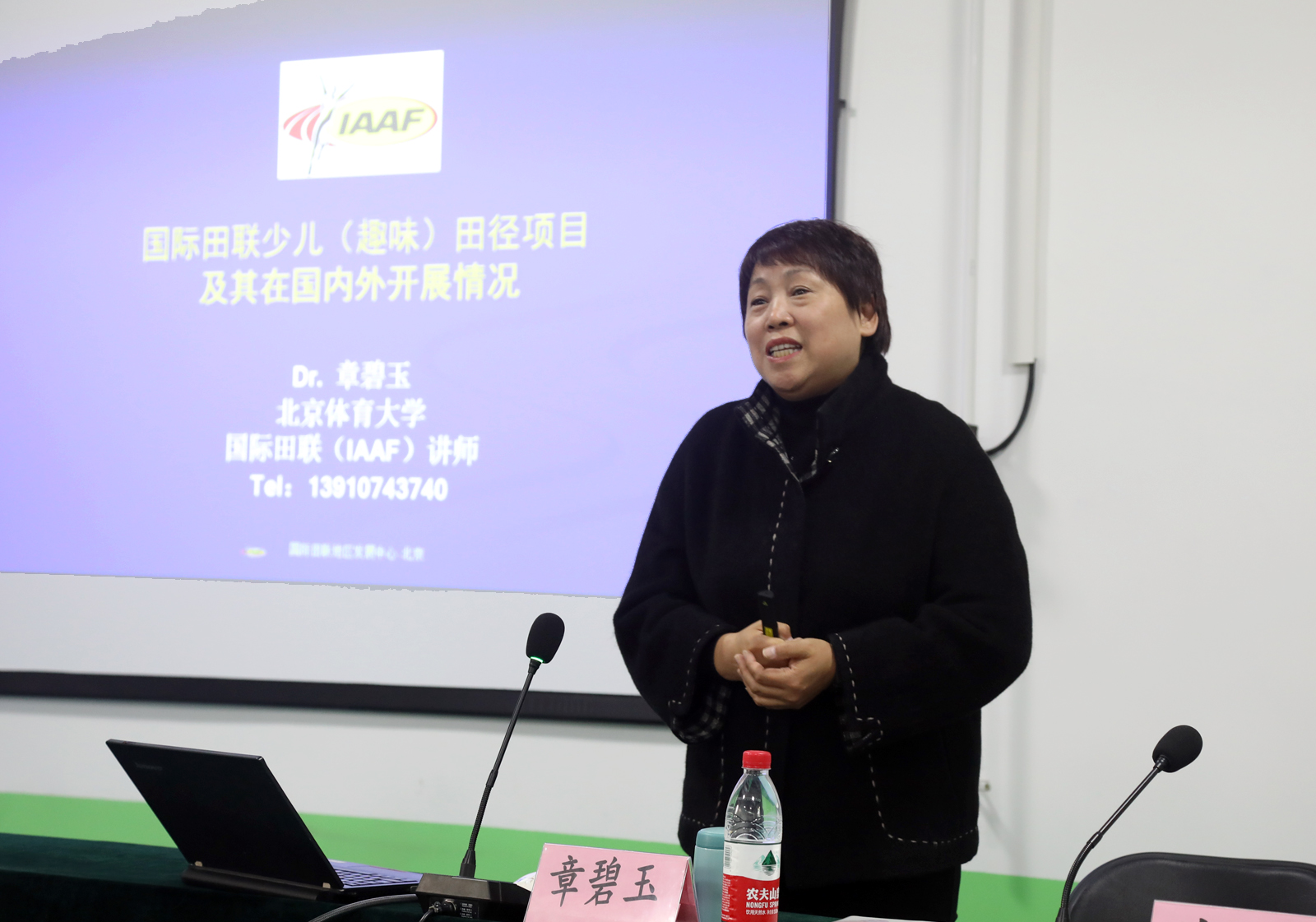 章碧玉教授主要围绕国际田联少儿(趣味)田径项目这一主题,从目前中小学体育面临的困境和青少年体质状况切入,简析了近年我国出台的学校体育方面政策文件和要求,并对少儿(趣味)田径项目的学理基础进行了分析,提出了以活动促进学校体育管理、教学改革、增强体质、推动发展的理念;章教授对少儿(趣味)田径项目构成的基本原则、目标、比赛项目设置、竞赛形式等方面做了系统的介绍,并展示了国际、国内该领域的发展情况,与在场师生进行了交流互动,对学生提出的问题进行了解答。