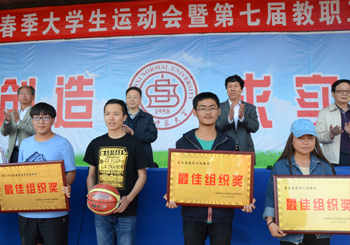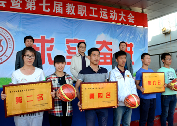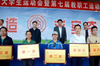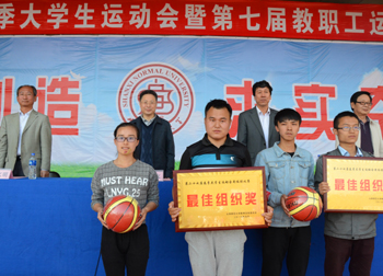 运动会总裁判长闫保红宣布比赛成绩:生命科学学院和历史与旅游文化学院获团体操表演最佳组织奖;学生组比赛前六名分别是生命科学学院、经济与管理学院、数计学院、物信学院、传媒学院和政法学院,最佳组织奖由化材学院、教师教育学院获得;教工组比赛前六名分别是生命科学学院、图书馆、化材学院、机关一工会、教师教育学院和数计学院,物信学院、机关二工会摘得最佳组织奖。
