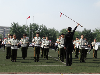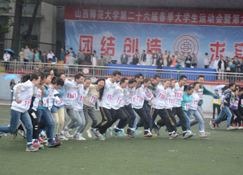 上午九点,运动会正式拉开帷幕。我校国标舞队进行开场舞表演,女生着红色短裙,男生着黑色西装,活力四射的舞蹈令整个田径场沸腾。随后,独具学院特色的团体操比赛有序进行。打头阵是新成立的书法学院,他们以太极为主,彰显博大的中华文化;文学院文用红黄相间的旗帜摆出“2015”“师大”“文院”“文武”的字样展示“文动乾坤,气冲霄汉”的气势;教育技术与传媒学院在黄河大合唱的旋律中带我们重走红色征程,用肢体动作诠释中华精神。随后的比赛中,各学院代表队分别利用彩带、彩旗、扇子、绸带等道具,不断摆出造型,变化队形。“国旗”、“团旗”、“中国梦”等跃然呈现在绿茵场上。全校师生沉浸在这片欢乐青春活力与激情热烈的气氛中。