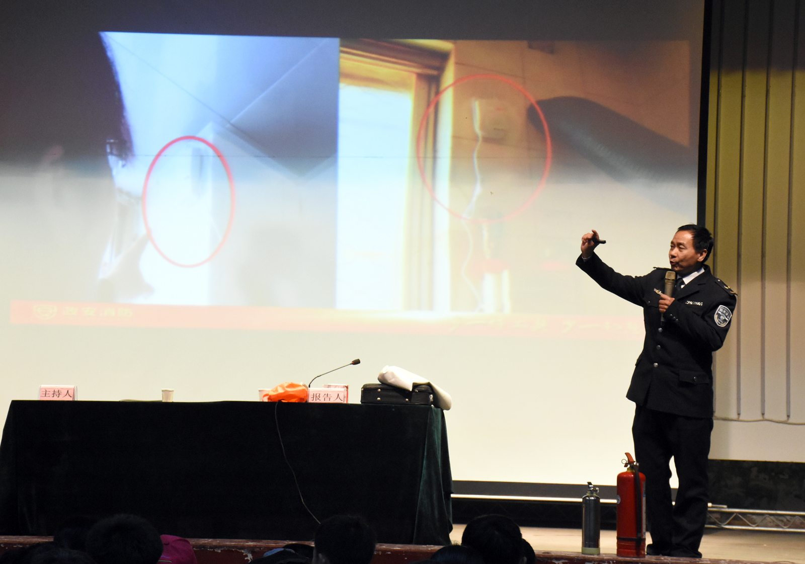 本次讲解的主要内容是消防管理、消防基础知识、高校防火知识及火灾预防、初起火灾扑救、火灾现场自救逃生、家庭防火与逃生的基本常识。宣讲员用诙谐幽默的语言将冷冰冰的火灾案例讲解得绘声绘色,并通过提问的方式与现场师生进行互动,让大家在日常生活中懂得火灾的预防,提醒大家要养成“人走电断”的好习惯。同时,他还向大家讲解了起火逃生的方法、手段并演示了灭火器的使用方法,精彩的讲解让大家受益匪浅,使学生对消防安全有了很高的认识。