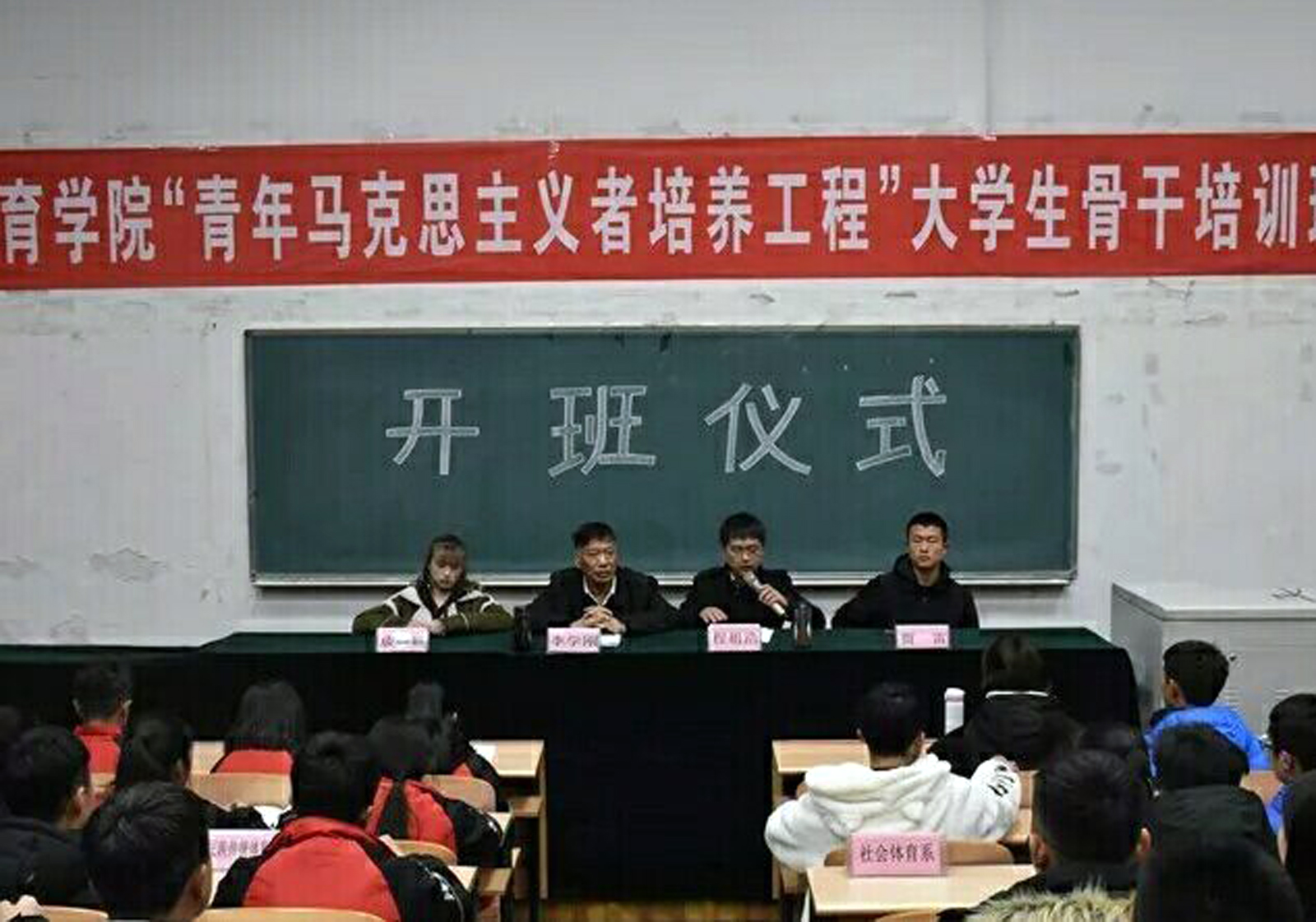 为深入学习贯彻党的十九大精神,培养7790cnm必发集团团学干部精英。11月24日晚7:00,7790cnm必发集团“青年马克思主义者培养工程”大学生骨干培训班在阶1教室举行开班仪式。院党委书记李学刚出席并讲话,院团委副书记成婉毓、院学生会主席贾雷和各系团总支书记、学生会主席参加,以及“青马工程”培训的院系主要团学干部和大一、大二班长团支书129名同学参加。开班仪式由院团委副书记程祖浩主持。