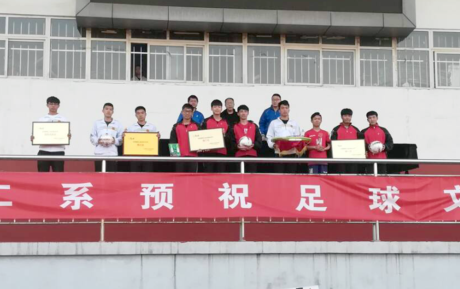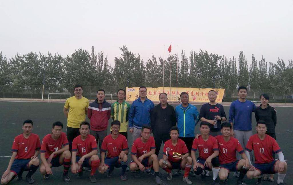 在闭幕式上,二系副主任李向前做了的总结,他对本次活动进行了全面总结点评,并对本次活动中表现出色的运动员、裁判员、学生会工作人员进行了表扬。接着我系大一大二学生进行了团体操表演——易筋经。最后我系教工队和学生冠军队(1501班)进行了一场足球对抗赛,学生冠军队以2:0的分数赢得比赛。中场休息时,由吴峰山主任、院团委副书记程祖浩、李向前副主任为本次足球文化节系列活动中获奖的班级、个人颁发了奖状、奖品,为我系足球文化节系列活动画上圆满句号。(图文/贾镟业)