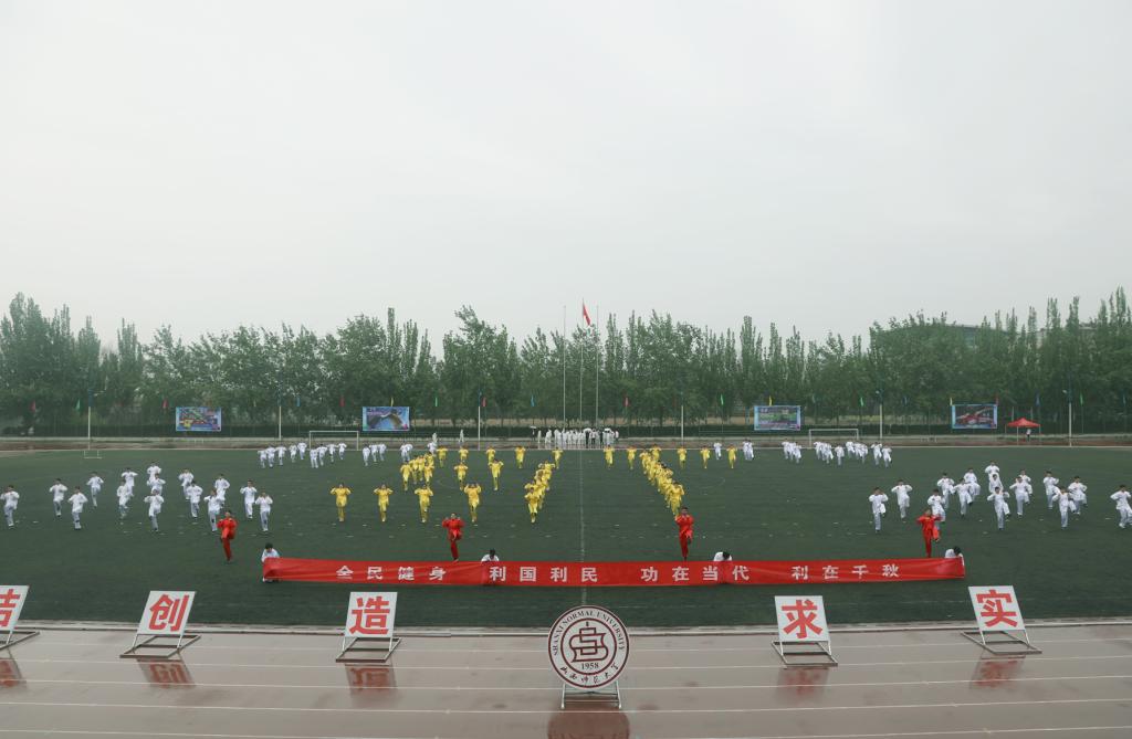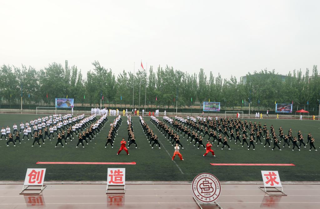 最后,各方阵退场,由体育教育系带来的八段锦表演拉开了团体操表演的序幕。八段锦是强身益寿、柔中带刚的养生功,体育教育系带来八段锦的表演将会场的气氛推向了高潮;社会体育系代表队带来的五禽戏生动完整的表现出虎之威猛、鹿之安舒、熊之沉稳、猿之灵巧、鸟之轻捷,体现了中国传统养生的魅力;民族传统体育系带来的24式太极拳,是将意识、呼吸、动作三者结合为一的内功拳法,动作以松柔入手,练劲养气,可缓可快,柔中寓刚,刚中有柔,彰显了华夏武术的魅力;运动训练系带来的健身气功六字诀,展现了运动训练系充满正能量的激情与活力;最后由体育教育二系带来的易筋经表演,动作整齐划一,精神抖擞,将体教二系的精神风貌表现的淋漓尽致。