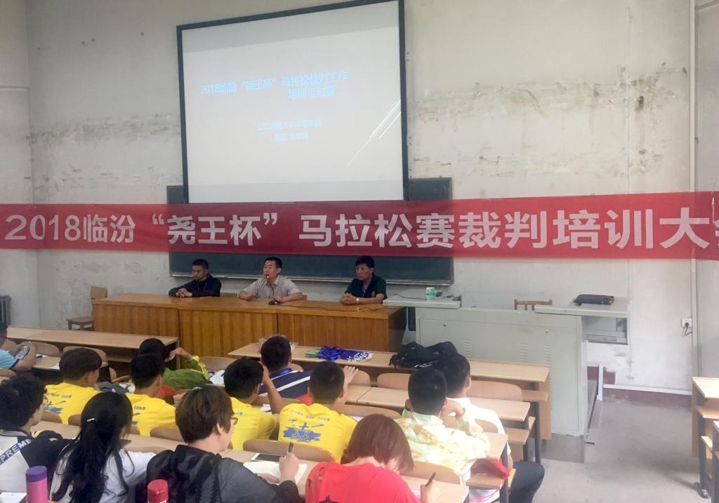 本届马拉松赛事是临汾市首次举办,加之马拉松赛路线长、时间长、参与人数多、参赛运动员水平差异大、赛道开放等诸多因素,给此次裁判执裁工作带来了较多压力,为了能顺利完成裁判任务,我院领导非常重视,于5月25日上午在体院阶一教室举行了“2018临汾’尧王杯’马拉松赛裁判培训大会”,副院长卢向阳出席了本次培训会,并做了讲话,同时提出了要求与希望。会上,竞赛主管、田径国家级裁判员张振副教授部署了本届马拉松赛裁判工作,明确了裁判分工与定位,详尽讲解各裁判组工作任务与职责。