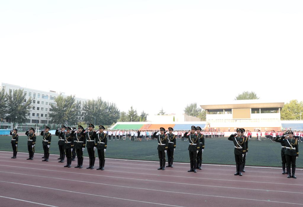 第十三届、十二届国旗护卫队队员在《解放军进行曲》的嘹亮声中步入田径场,院党委书记李学刚为第十三届国旗护卫队授旗,第十三届国旗护卫队迎接国旗并进行新学期升国旗。