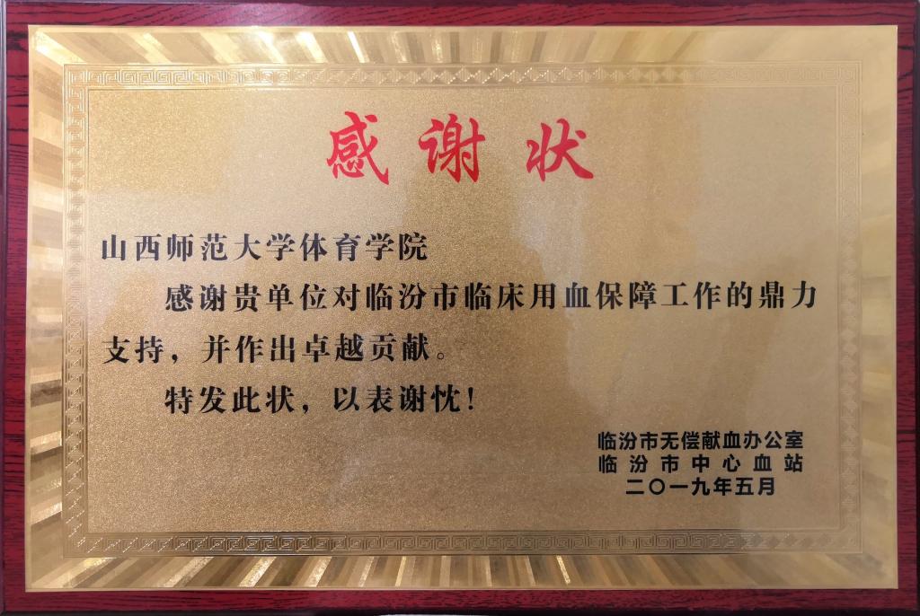 活动结束后,为了感谢我院师生一直以来热心参与无偿献血这项公益事业,临汾市无偿献血办公室、临汾市中心血站为我院颁发了“感谢状”,感谢我院对临汾市临床用血保障工作的鼎力支持,并作出卓越贡献。(院团委供稿)