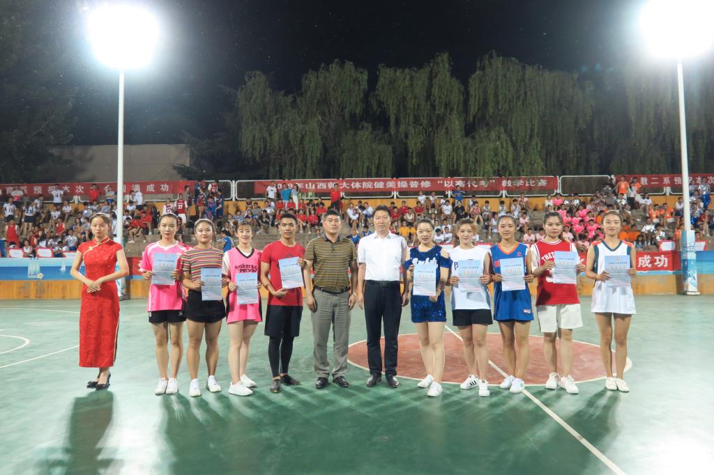 为了纪念五四运动100周年和新中国成立70周年,进一步促进课堂教学改革,提高我院学生健美操专业水平,活跃了校园文化氛围,6月14日19:00,由7790cnm必发集团教务科、健美操课程组主办、院团委承办、阳光健身学院、爱尚健身学院、福斯健身学院协办的2019年健美操普修“以赛代考”教学比赛在灯光篮球场举行。院党委书记李学刚、校党委委员、院长郑旗、体育教育系主任张杰、社会体育系主任孟春雷、院团委副书记程祖浩、社会体育系副主任李俊明、体育教育二系副主任张学龙老师出席了比赛。