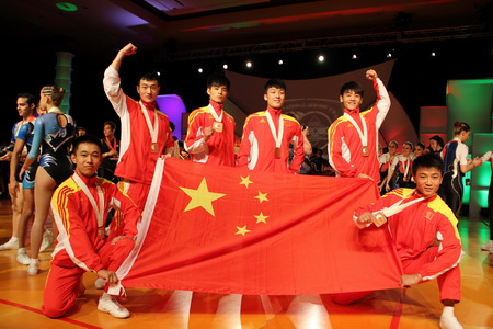 2012年世界健美操冠军赛领奖台上与冠军、亚军合影