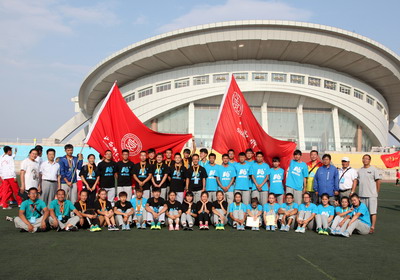 大同大学校长常乃军(中)为我校体育院系组(左3)颁发团体奖杯 |