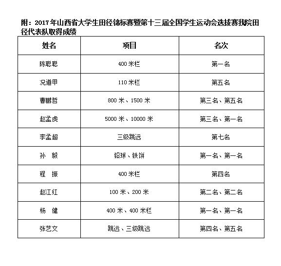 2017年3月4-5日,由山西省教育厅主办、山西省学生体育协会承办的2017年山西省大学生田径锦标赛暨第十三届全国学生运动会选拔赛在山西大学举行。来自山西大学、太原理工大学、中北大学、大同大学等12所高等学校的220名大学生参加了比赛。我院田径代表队在副院长卢向阳的带领下,派出5名教练员和11名运动员参赛。全体参赛运动员经过团结协作、努力拼搏,最终在17项田径项目中,共获6金、2银、2铜的优异成绩。