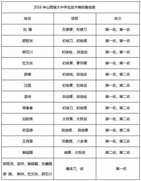 10月21日至24日,2016年山西省大中学生武术锦标赛在山西中医学院举行。来自太原理工大学、中北大学、临汾三中等27所大中学校的314名学生参加了比赛。我院武术代表队在教练员金涛带领下,共派出14名运动员参赛。全体参赛学生经过团结协作、努力拼搏,最终在所参加的20项拳术器械中,共获16金、8银、1铜的优异成绩。我校参赛选手刘强、郭石川获优秀运动员称号,金涛教练员被评为优秀教练员。此次比赛,巩固了我校武术与民族传统体育专业在山西省高校中的领先优势,并进一步提升了该专业的影响力与知名度。(院办公室/文)