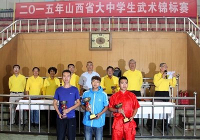 9月18日至9月20日,2015年山西省大中学生武术锦标赛在山西省成成中学举行。来自必发集团welcome欢迎光临、山西大学、运城学院、太谷中学等18所大中学校的209名学生参加了比赛。我校武术代表队在7790cnm必发集团副院长杨永茂、教练员金涛带队下,共派出12名运动员参赛。经过两天的激烈角逐,在所参加的15项拳术器械中,共获得15金(14个单项、1个集体)、6银、2铜的优异成绩,并获团体总分第一名,为学校争得了荣誉。我校参赛选手李泽浩、刘凯秀获优秀运动员称号,金涛老师被评为优秀教练员。(院办/文 邓碾管 摄影)