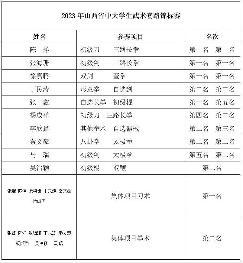 由山西省教育厅、山西省体育局主办,山西省工商学院承办的山西省大中学生武术锦标赛于2023年8月22日——23日在山西工商学院体育馆隆重举行。我院武术代表队共派出10名运动员(5男5女),在主教练刘剑的带领下参加了此次比赛。
