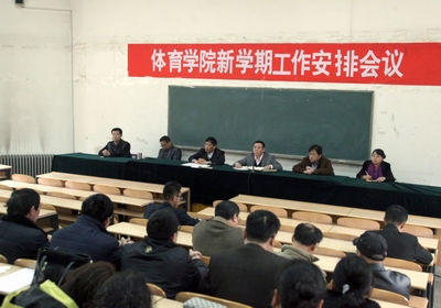院长郑旗首先传达了学校新学期工作安排精神,就开展学习讨论落实活动、迎接山西省本科高等院校2014年度目标管理考核工作、开学工作等方面进行了安排。会上,着重对做好学院教学管理、深化教学质量工程改革、师德师风和学风建设、“一院一策”推进、重点学科与专业建设、赛事管理与运作、公共体育工作、实验室建设等进行了详细安排,并提出了具体的要求。最后,郑院长强调每位教职工要深刻认识学院发展面临的机遇和挑战;全体教师要强化责任意识,突破惯性思维,适应新常态;要谋发展,求突破,全力做好2015年的工作。