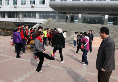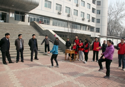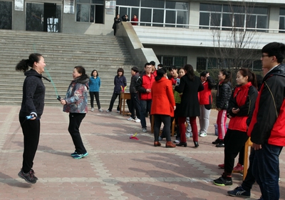 为迎接和庆祝2015年三八国际妇女节,3月7日上午,我院女教职工在教学楼前参加了由院工会主办的“踢毽子、跳绳”趣味比赛。校工会主席李春仁、副主席亢健和院党委书记李学刚、院长郑旗参加了活动。校工会主席李春仁向女同志表示节日问候。经过激烈的比赛,在双人跳绳和踢毽子比赛中,女教工充分发挥体育人的优势,以充沛的体力,坚持不懈的精神,齐心协力,把活动搞得有声有色。场上欢声笑语不断,场下加油呐喊声此起彼伏,充满了节日气氛。女教工在此次趣味比赛中度过了一个充实、愉快的节日。(院办供稿)