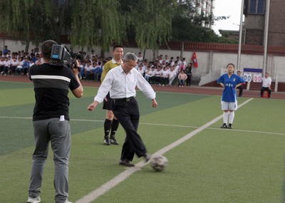 孝义市人大常委会副主任刘旺珠为联谊足球赛开球