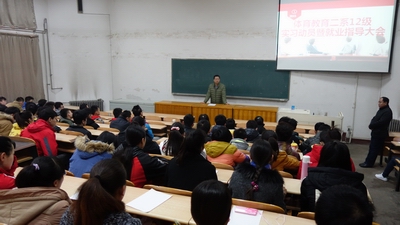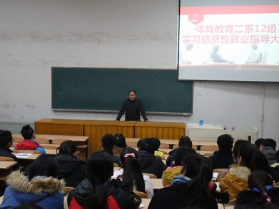 1月4日上午,在阶梯第一教室,召开了体育教育二系2012级实习动员既就业指导大会,王彤副院长做了实习动员报告,体育教育二系吴峰山主任、教务科实践教学管理许登云老师对实习工作进行了具体部署,段东升副书记做了就业指导报告。