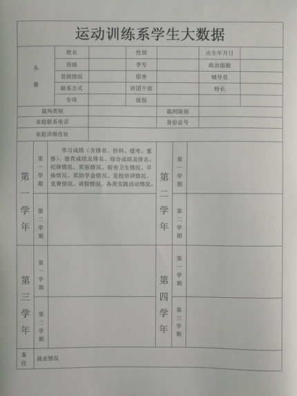 四、学生信息大数据库建设:大数据时代的到来,任何一项举措都需要有大数据支撑。为更加有效管理学生,运动训练系着手构建了从新生入学到毕业共八学期的在校情况大数据表。这样可以即时、快速、准确的掌握每位学生在校情况。大数据包括学生基本信息、卫生评比、获奖情况、奖助学金评定、学习情况、奖惩情况等三十几个方面的内容。
