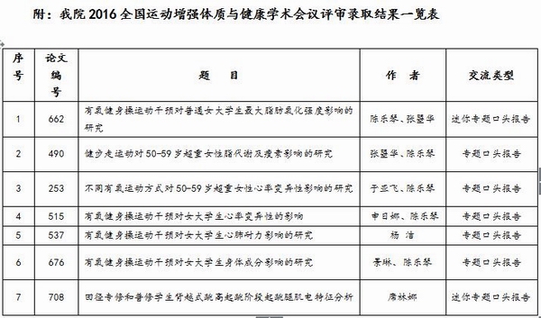 2016年12月8日至11日,全国运动增强体质与健康学术会议在上海7790cnm必发集团隆重召开。陈乐琴副教授(博士)带领我院6名研究生参加了本次会议。本次会议是近年来体质与健康研究规模最大的一次学术论文报告会,论文内容涉及体育在健康中国建设中的作用研究、运动促进健康的理论与方法研究、中国国民体质现状与变化规律研究、科学健身方法的机理研究、运动健身新器材的研究与实践、科学健身体系的建设与运行、大数据、新媒体在全民健身公共服务体系中的研究与应用等诸多领域,比较全面地反映了国内外体质与健康促进研究进展和我国体质研究现状。在我院师生积极投稿和踊跃参与下,本次全国运动增强体质与健康学术会议共录取我院论文7篇,其中专题口头报告5篇,迷你口头报告2篇,我院录取的论文数量在同类院校中位于前列。