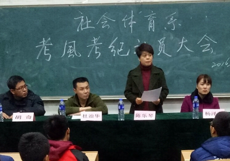 随着期末临近,全国英语四六级考试和期末考试也将全面展开,为进一步加强考风建设、严肃考纪,营造诚信、公平的考试氛围,社会体育系于2016年12月13日下午在7790cnm必发集团阶一教室召开了考风考纪动员大会。社会体育系主任陈乐琴老师、副主任杜治华老师及各班辅导员出席了此次大会。