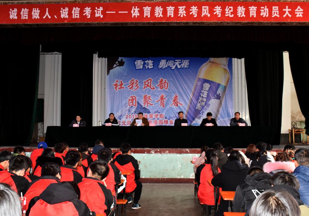 1月8日上午10点,体育教育系“诚信做人,诚信考试”考风考纪教育动员大会在大礼堂如期召开。系主任杨海龙老师、副主任张杰老师、各班辅导员及全体同学参加了会议。