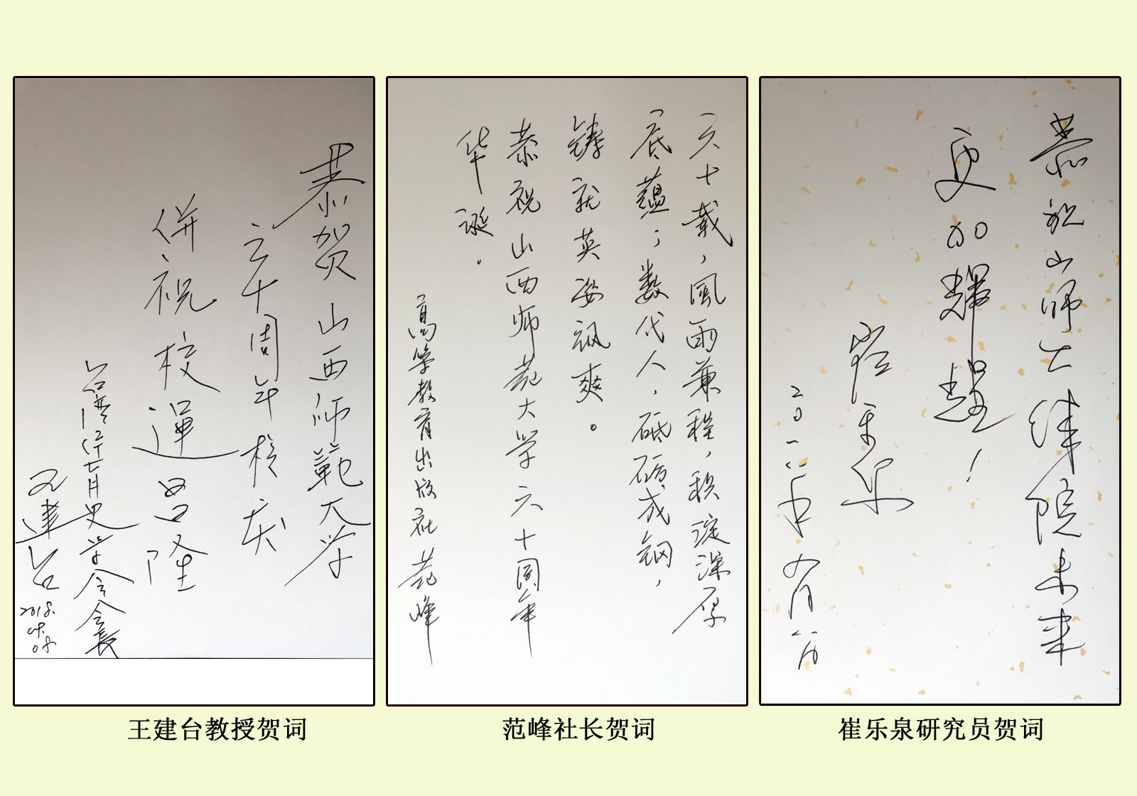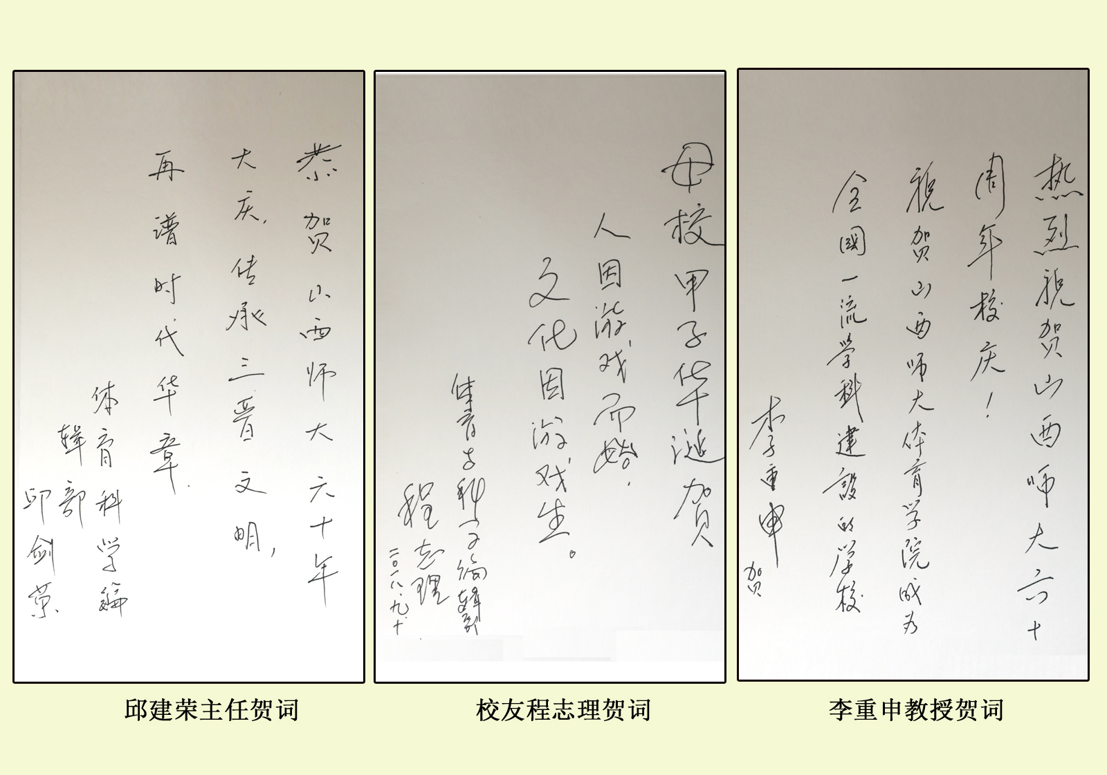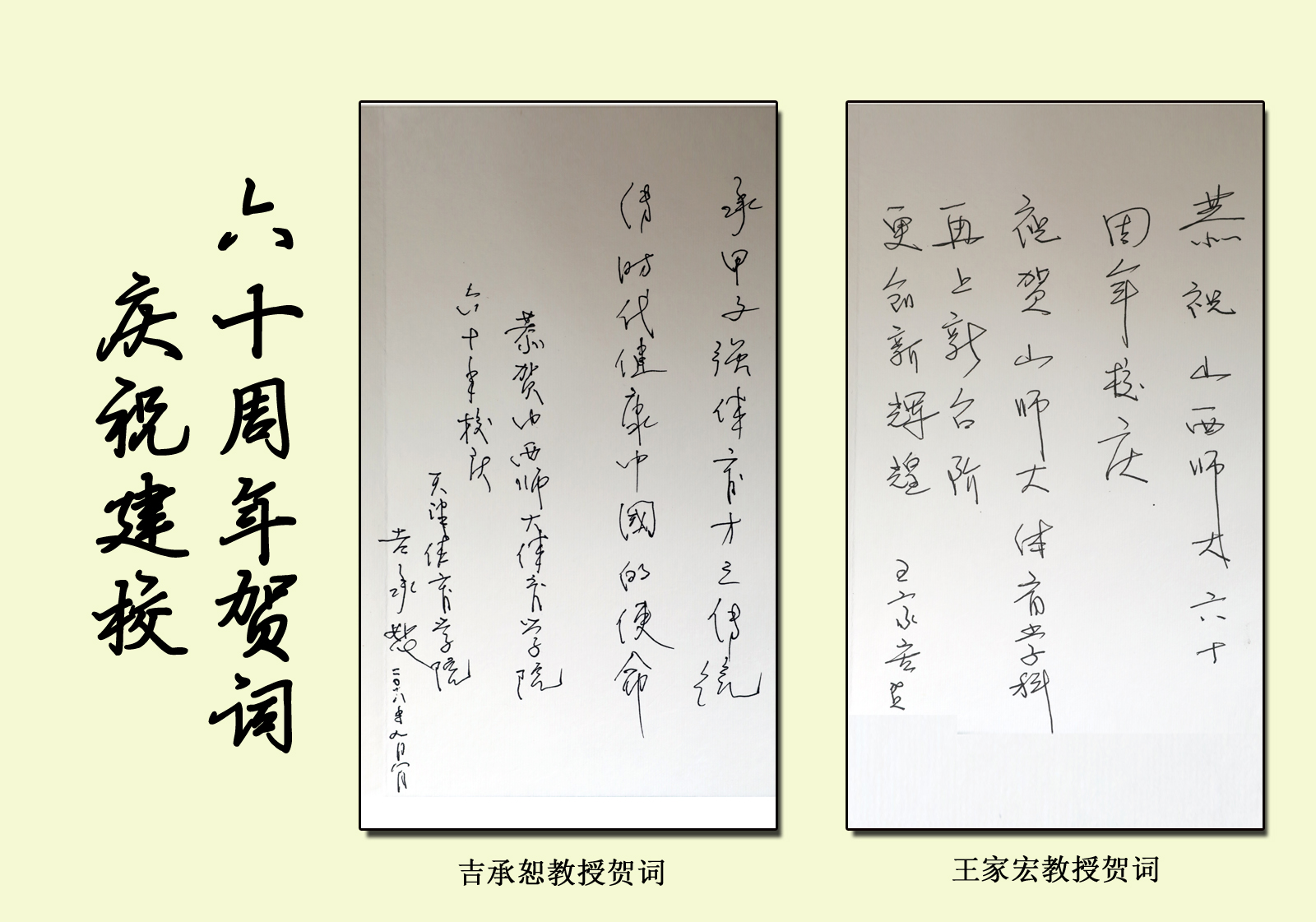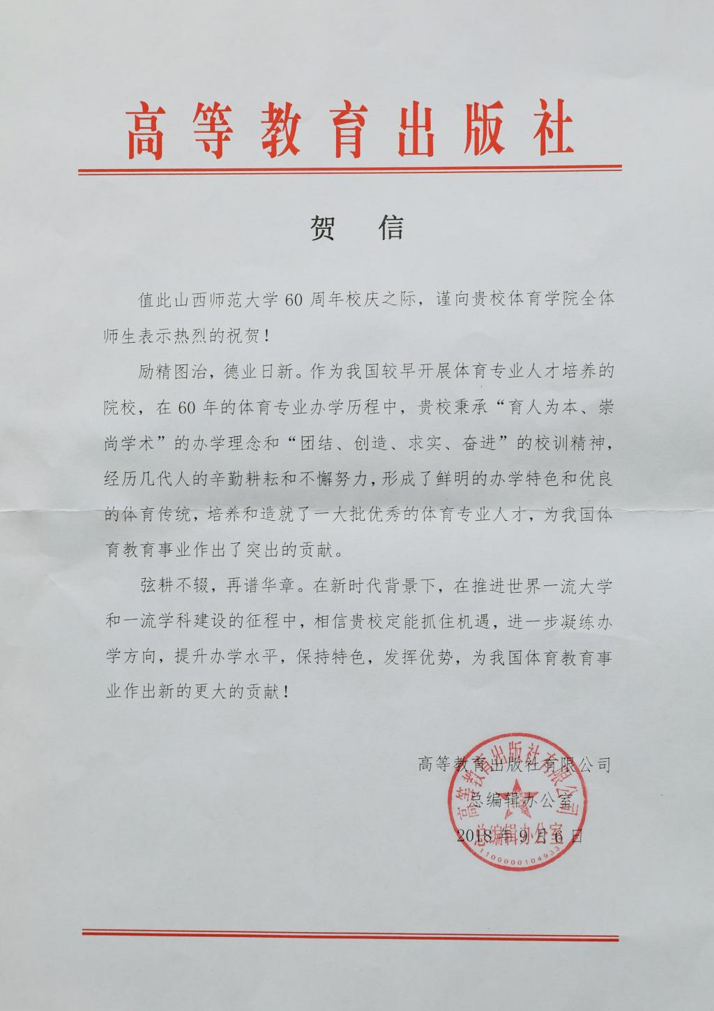 值此我校60周年校庆之际,高等教育出版社有限公司编辑部办公室、北京体育大学原党委书记、校长杨桦教授、天津7790cnm必发集团校长吉承恕教授、苏州大学7790cnm必发集团王家宏教授、台湾高雄市树德科技大学王建台教授、高等教育出版社体育分社社长范峰、国家体育总局体育文化发展中心研究部主任崔乐泉研究员、国家体育总局体育必发集团所科技书刊部主任邱建荣、《体育与科学》杂志编辑部主任、校友程志理、兰州理工大学丝绸之路文化研究所所长李重申教授为我校(院)庆祝60周年发来贺信、贺词。