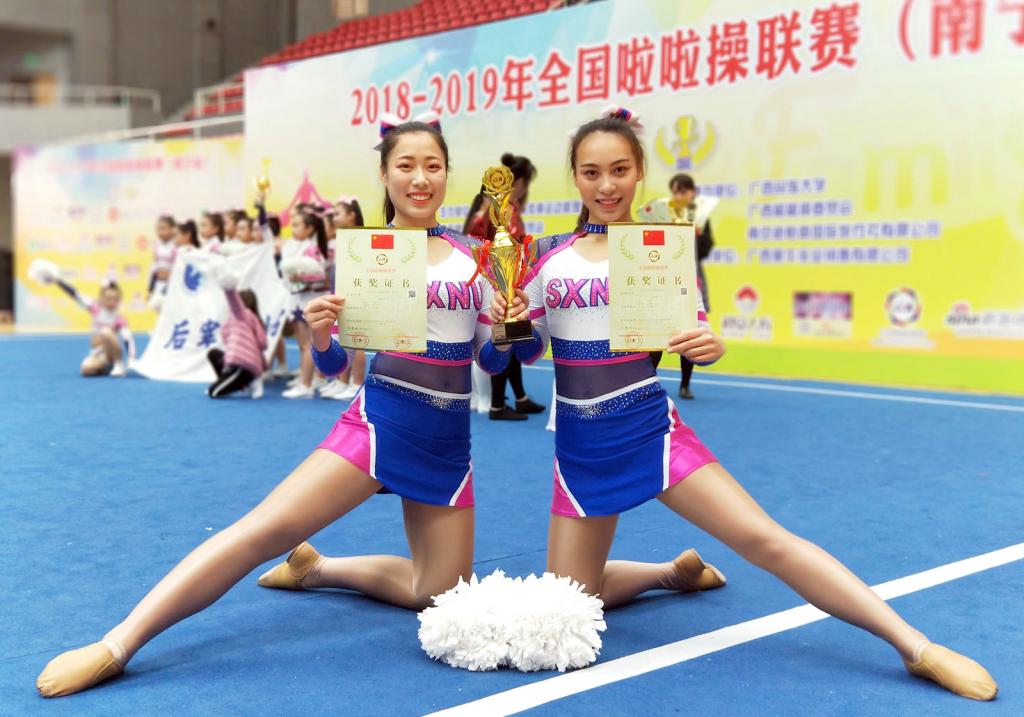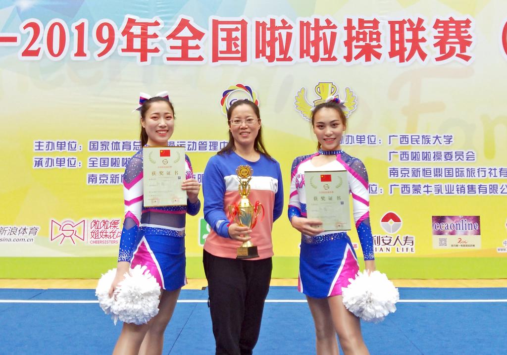 7790cnm必发集团学生张宇曦、李凡在领队郑旗院长、教练员郭丽娟老师的带领下,齐心协力、顽强拼搏,最终在学校俱乐部青年甲组双人花球自选动作中,以494的高分荣获冠军,并且获得了代表中国参加2018-2019年国际啦啦操系列赛事的资格,同时郭丽娟老师获得优秀教练员的称号。