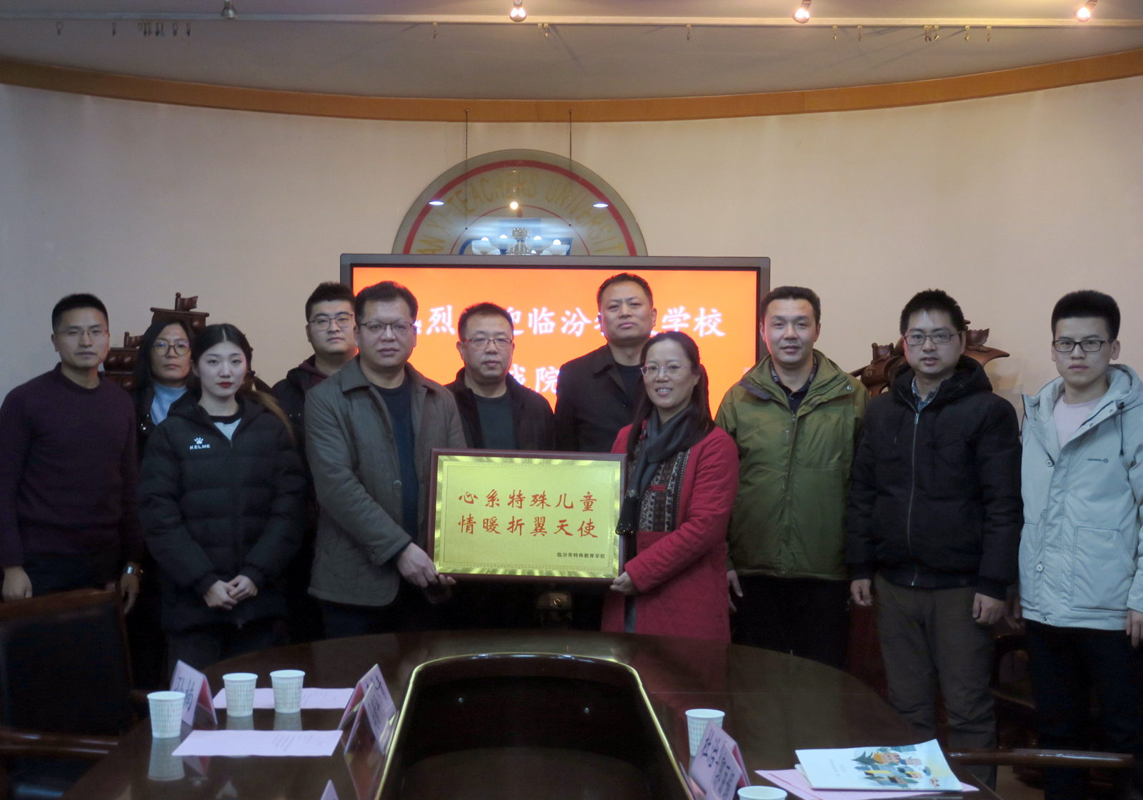 许国宝对临汾特教学校一行人的到来表示热烈欢迎,并介绍我院的基本情况。他强调要进一步加强大学生服务社会的能力,积极倡导大学生参加社会实践活动,以“不忘初心、牢记使命”主题教育为契机,进一步落实好“立德树人”的根本任务,不断增强基层党建的引领作用,打造品牌活动,形成特色。最后,特教学校向我院赠送牌匾并合影留念。(闫培烨/文)