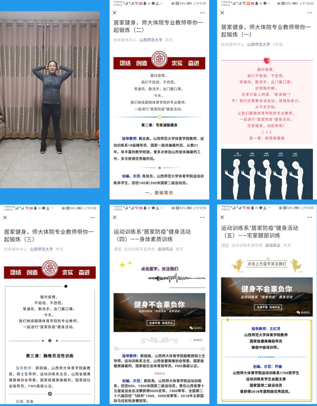 我院运动训练系党支部积极响应,举办“居家防疫”健身活动(在线视频赛)。运训系党支部书记郭丽娟给大家提供“宅家健身小课堂”活动推进方案和健身方案文字稿模板,同学们积极参加,发挥自身专业特点与优势,制作了不少优秀作品,被由山西省体育局联合网易共同推出的《居家健身小课堂》系列节目选中。同时,郭丽娟老师亲自上阵,录制了肩颈保健操视频,为在家办公和学习的人员提供了放松肩颈的方法,得到了一致好评。在此次活动的影响下,我校新媒体中心利用大家录制的素材推出了“居家健身”的栏目,满足了广大师大学子的需求。