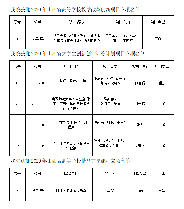 近日,山西省教育厅发布《关于公布2020年山西省教学质量提升工程各类项目立项名单的通知》,公布2020年山西省教学质量提升工程各类项目立项名单。我院各类项目共获批立项6项。其中获批教学改革创新重点项目1项,大学生创新创业训练计划项目4项(重点1项,一般3项),精品共享课程认定类1门。