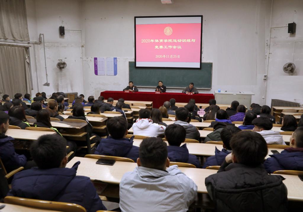 11月25日晚,学院2020年运动训练专题工作会议在阶一教室召开,会议旨在总结疫情期间各项目代表队竞赛训练情况,安排部署代表队冬训与参赛工作。院领导许国宝、郑旗、卢向阳,田径、武术、健美操等12支代表队的教练员,男女篮球代表队及足球代表队学生参加会议。会议由副院长卢向阳主持。