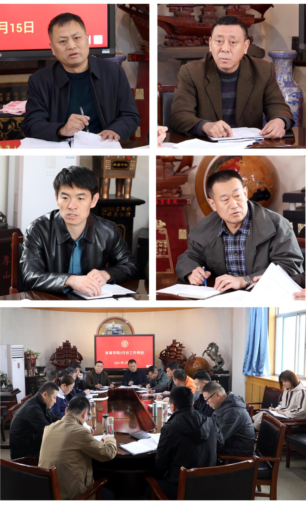 院长郑旗在会上指出,今年是“十四五”开局之年,学校进入了发展的关键阶段,学院要紧跟学校步伐,按照年度工作安排,紧盯时间节点,扎实推进各项工作。他强调,一是各部门认真完成近期党务各项工作,围绕学院中心工作抓党建,推动党建和业务工作深度融合。二是优化工作流程,做好常规教学工作,严格教学管理和学生管理,促进学风教风建设。三是扎实做好教研活动,创新教研活动形式,助推教育教学质量提高,有效促进教师专业发展。四是高度重视研究生毕业论文预审读、课题申报与常规竞训工作,厚植学科发展内涵,建立长效机制,稳步推进工作有效落实。