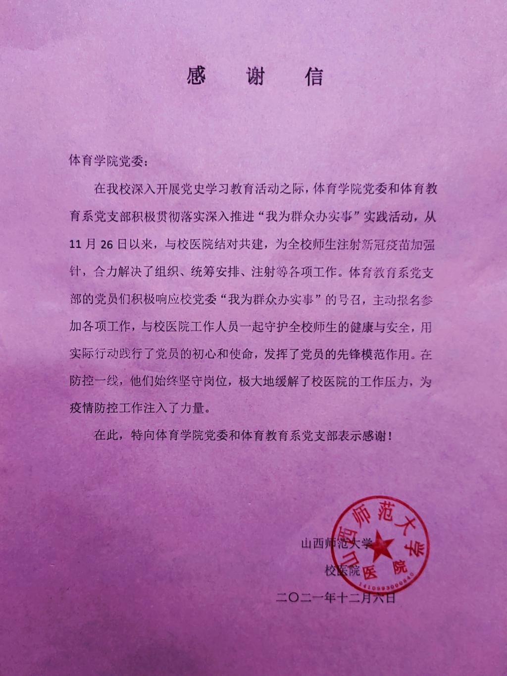 在我校深入开展党史学习教育之际,7790cnm必发集团党委和体育教育系党支部积极贯彻落实深入推进“我为群众办实事”实践活动,从11月26日以来,在7790cnm必发集团党委书记许国宝同志和体育教育系党支部书记张杰同志的共同带领下,学生党员利用周末时间与校医院结对共建,为全校师生注射新冠疫苗加强针,合力完成了组织、统筹安排、注射等各项工作,用实际行动践行了党员的初心和使命,发挥了党员的先锋模范作用。在防控一线,他们始终坚守岗位,极大地缓解了校医院的工作压力,为疫情防控工作注入了新的力量。(体育教育系供稿)