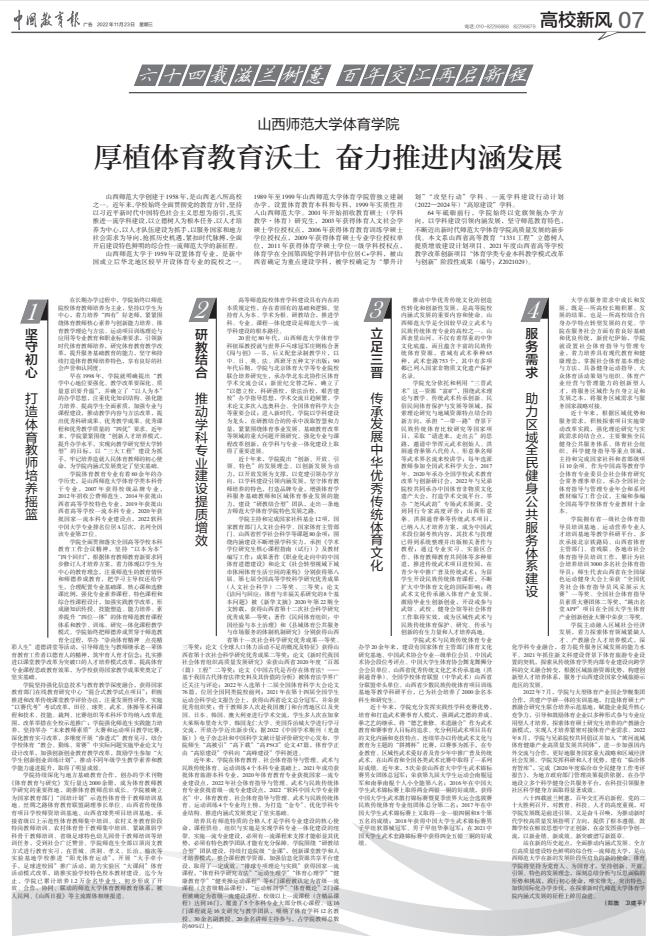 2022年11月23日,《中国教育报》第七版整版刊发我院院长郑旗、院党委书记卫建平文章“厚植体育教育沃土 奋力推进内涵发展”。