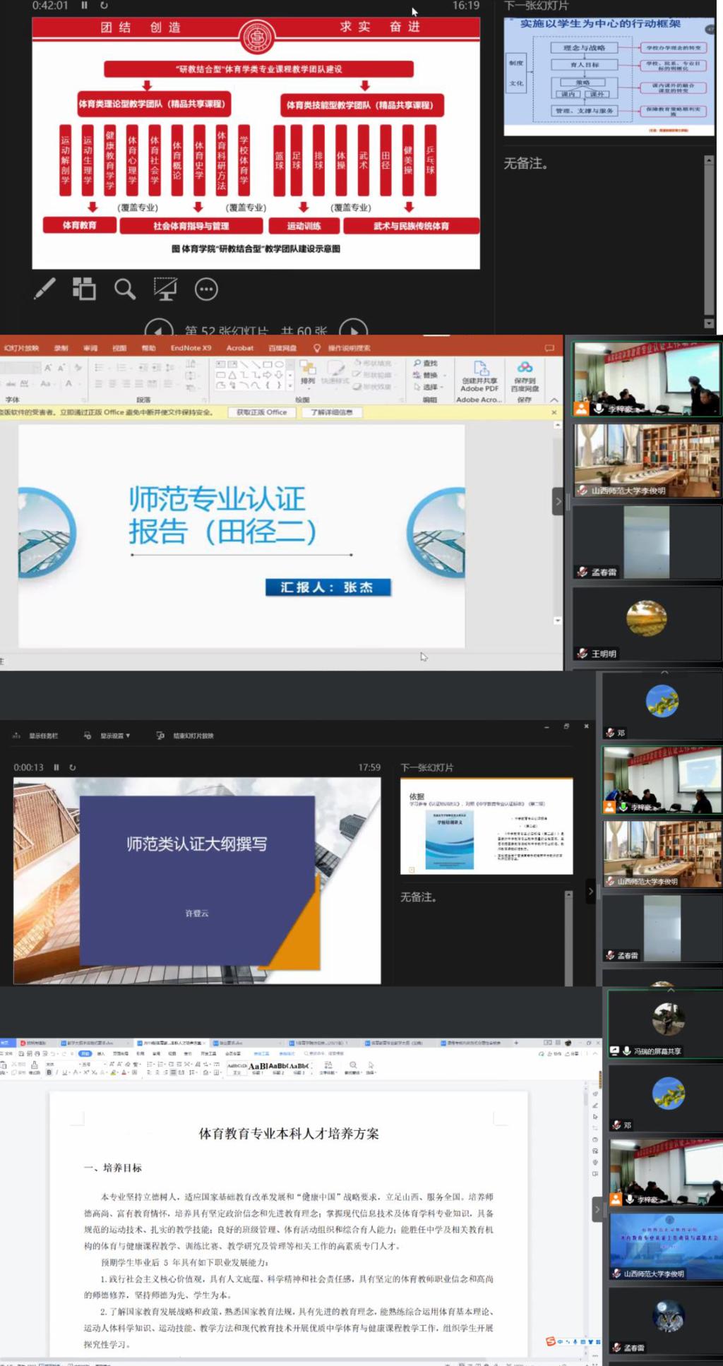 会上院长郑旗教授作了《加强体育教育国家一流专业建设扎实推进师范类专业认证工作》的动员报告,报告简析了师范专业认证工作的政策文件精神,指出师范专业认证是一种专业质量外部保障机制,遵循以“学生中心、产出导向、持续推进”为基本理念,抓住专业认证的“两个关键”问题,明晰专业认证的逻辑主线,强化专业基础建设,反思课程教学改进的策略,以保障师范专业人才培养质量按照毕业要求持续改进培养目标。胡青平教授对师范类专业认证的体系、程序、任务和理念等进行解读,强调认证要把住“两线”,并对认证工作流程和准备事项进行解读。郑旗、王明明、李海伟、张杰、许登云等5位教师对承担的体育教育专业课程教学大纲修订及课程目标与毕业要求达成度进行了交流。刘宏超副教授结合自己教育部工作经历,对体育教育专业课程教学大纲修订案例及相关工作进行评析,建议教师在修订教学大纲时要紧扣毕业要求,融入课程思政的理念及内容,注重课程评价设计。教务科科长冯瑞安排体育教育专业教学大纲修订及相关工作,强调大纲修订的规范性。会上副院长孟春雷部署安排了下一阶段体育教育专业认证的重点工作和完成各项任务的时间节点与要求。