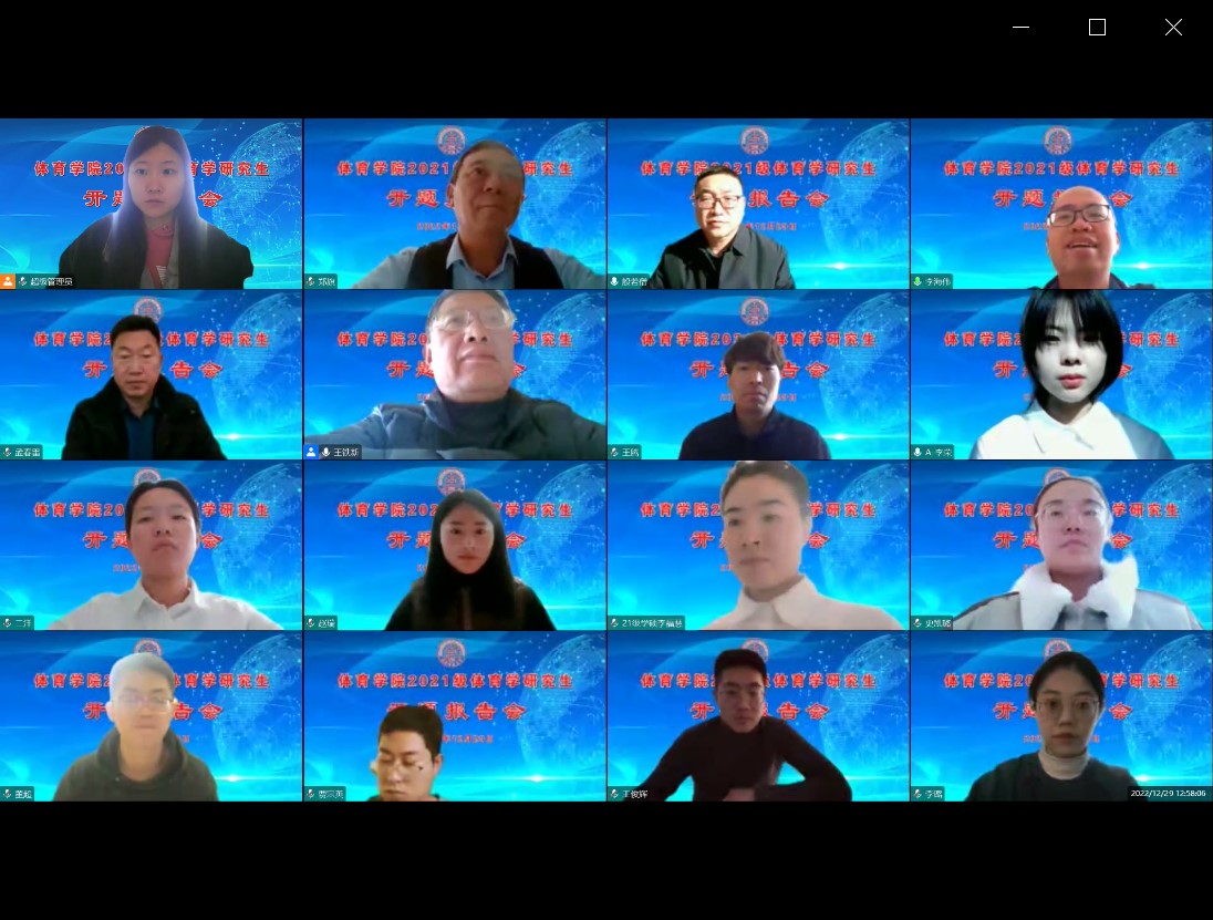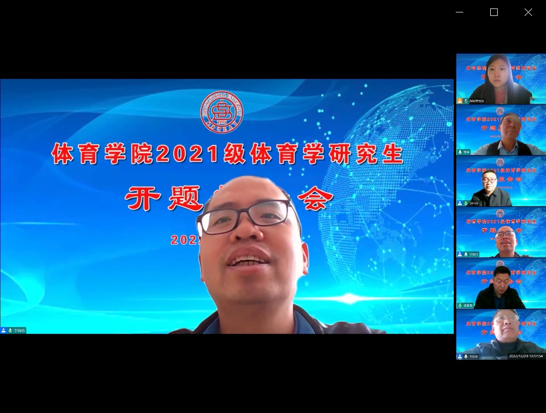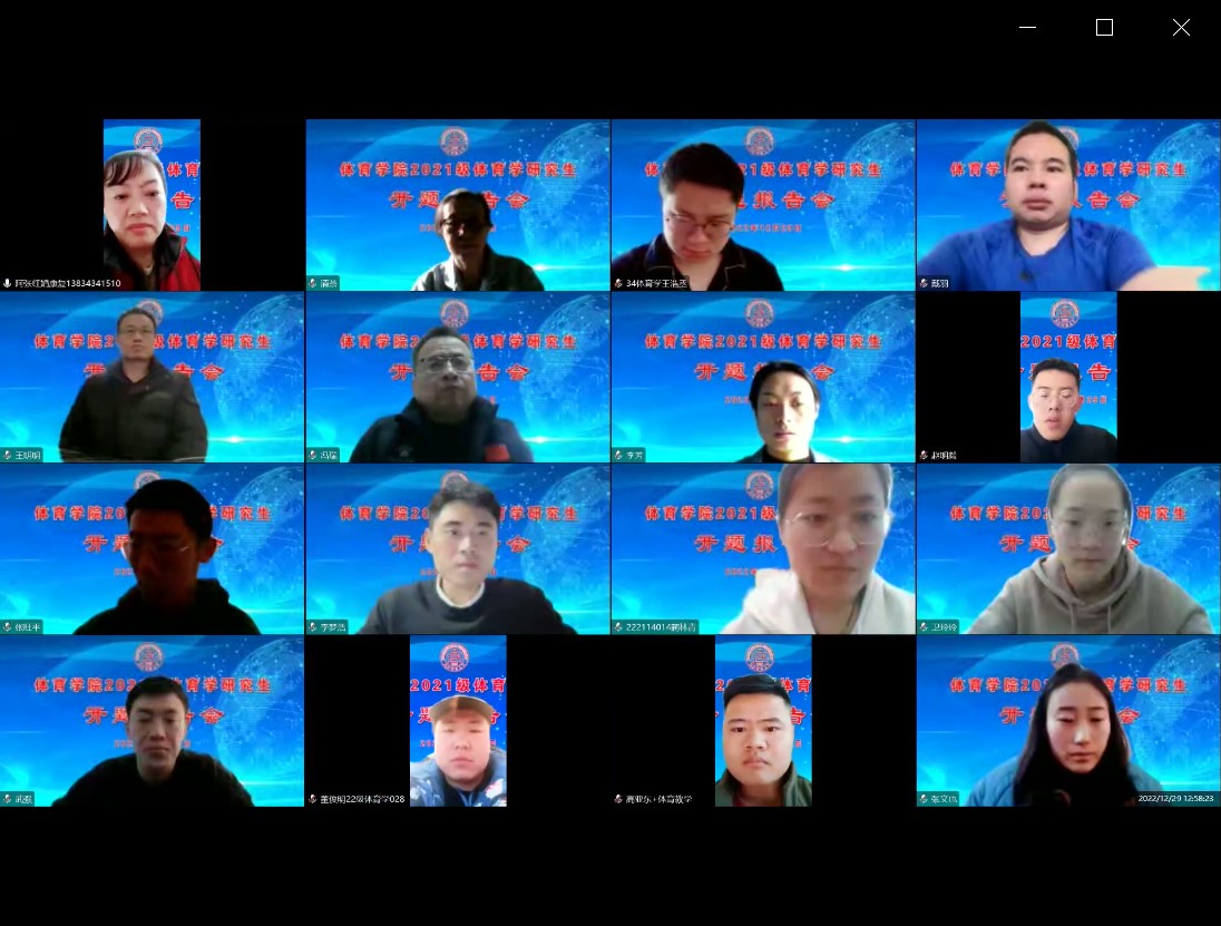 12月29日,我院举行2021级体育学研究生开题报告会,39名体育学研究生分3组在线参加。李向前教授、孟春雷教授、王铁新教授分别担任组长并主持开题报告,2022级研究生旁听开题报告。李海伟副院长主持开题报告小结会。