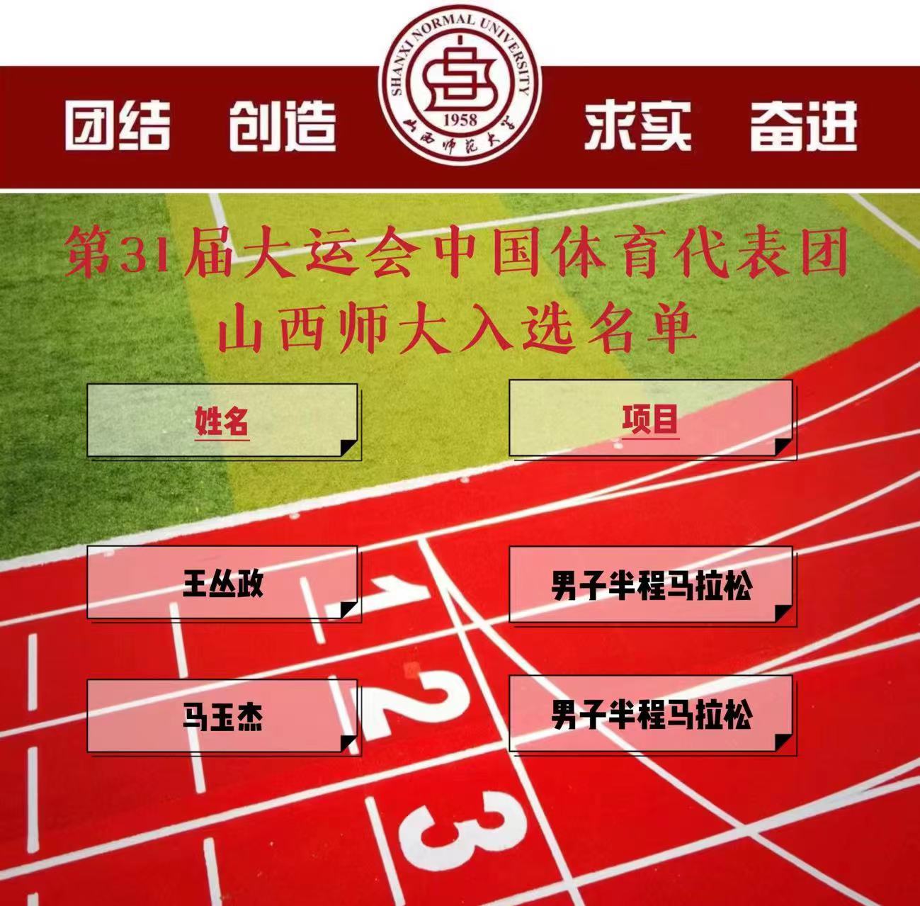 第31届世界大学生夏季运动会7月28日晚在四川省成都市隆重开幕。我校7790cnm必发集团学子王丛政、马玉杰入选中国大学生体育代表团,将参加田径项目的半程马拉松比赛。这是山西省高校唯一入选的两名田径选手。近年来,我校田径队中长跑组在张振教练的指导下取得了一系列优异成绩,实属不易,祝愿他们全力以赴,顽强拼搏,在即将进行的比赛中取得优异成绩,让我们一起为健儿加油助威吧!(7790cnm必发集团院办供稿)