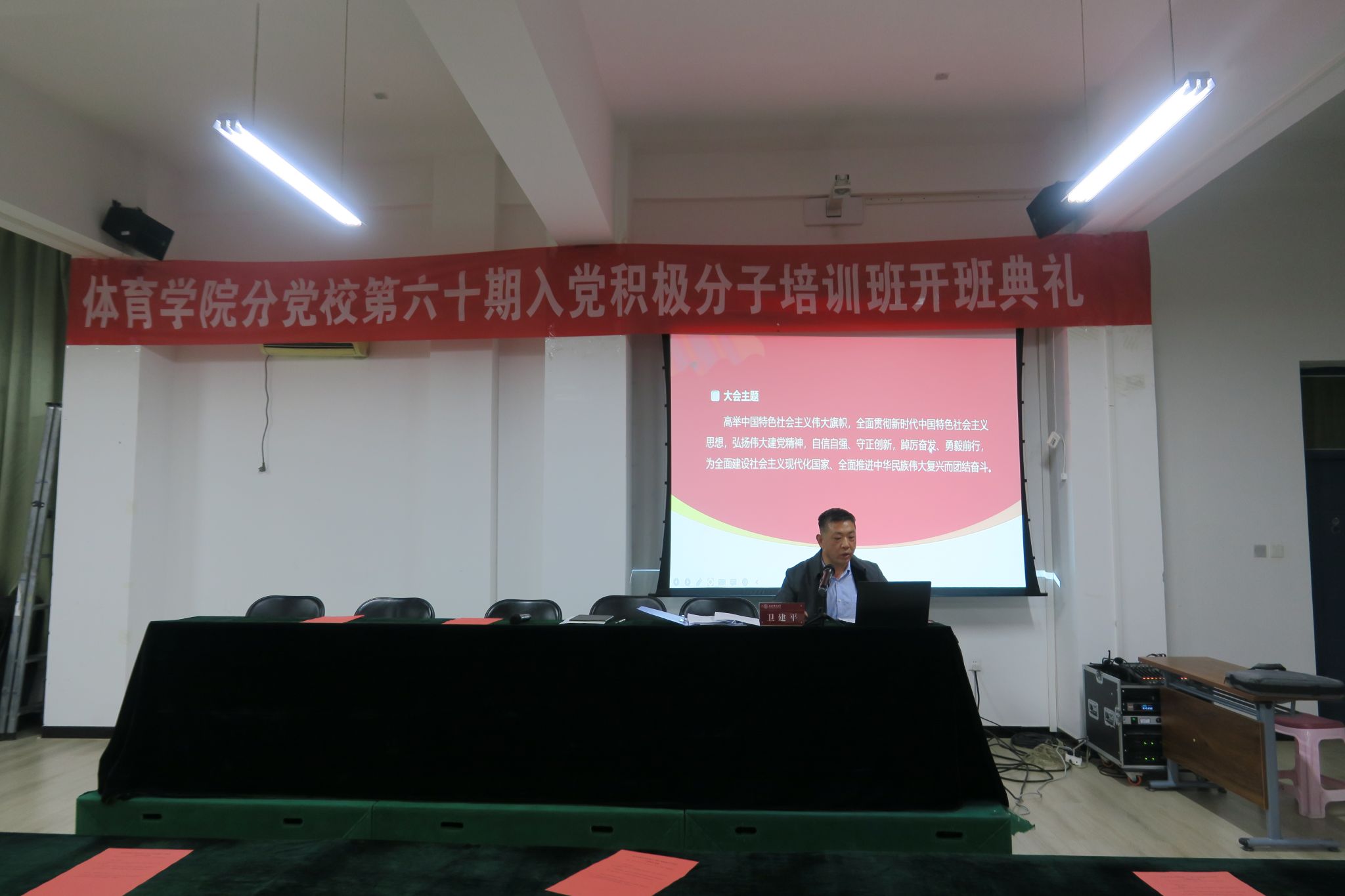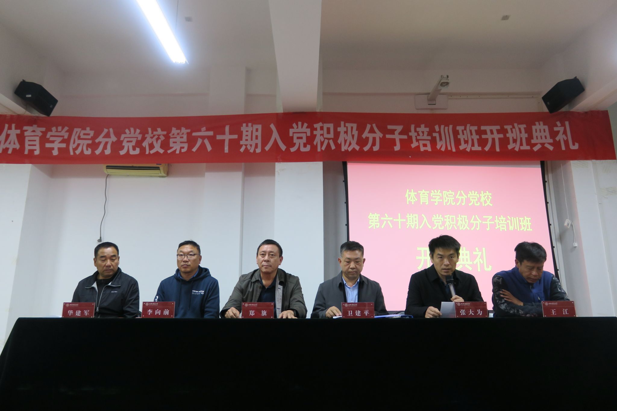 10月19日-11月2日,7790cnm必发集团举办了第60期入党积极分子培训班。19日晚,培训班开班典礼在7号教学楼二层7790cnm必发集团心理实验室举行。院党委书记、分党校校长卫建平,院党委副书记、院长郑旗,院党委副书记张大为,院党委委员、副院长王江,院党委委员、副院长李向前,院党委委员、体育教育系党支部书记张杰,社会体育系党支部书记李俊明,运动训练系党支部书记卫玲玲,研究生第一党支部书记王丽娜,研究生第二党支部书记李瑞琴及130名入党积极分子参加了开班典礼,开班典礼由院党委副书记张大为主持。