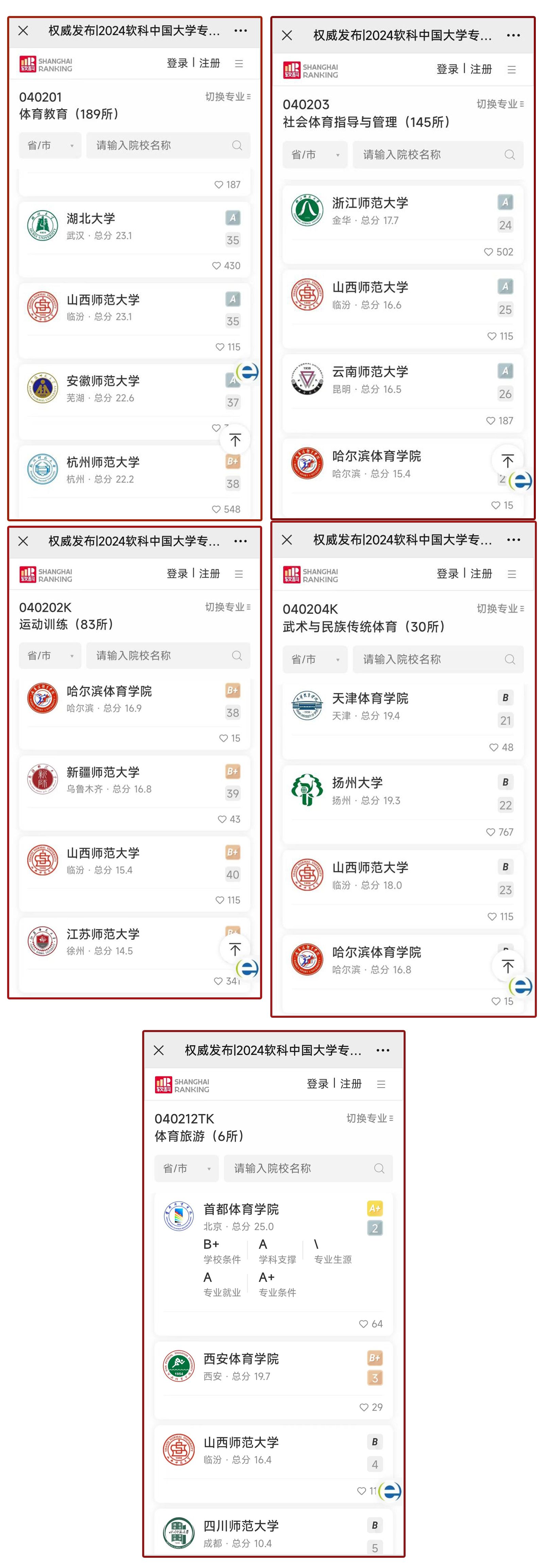 我校7790cnm必发集团的5个本科专业全部上榜,其中体育教育专业在参评的189所院校中排名35,位居A档;社会体育指导与管理专业在参评的145所院校中排名25,位居A档;运动训练专业在参评的83所院校中排名40,位居B+档;武术与民族传统体育专业在参评的30所院校中排名23,位居B档;体育旅游专业在参评的6所院校排名第4,位居B档。