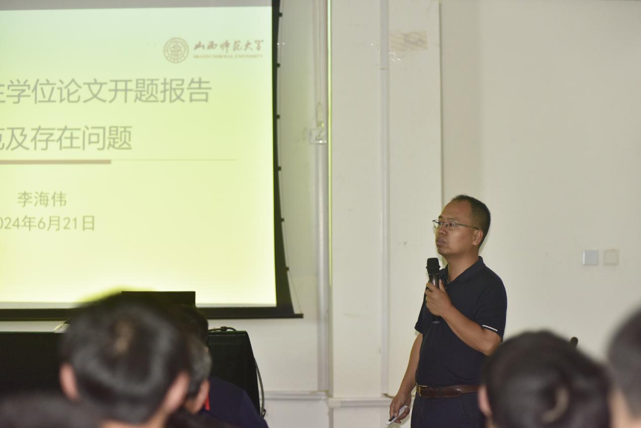 报告会上,李海伟教授首先讲述并展示了学院对研究生开题报告的具体格式要求,随后围绕开题报告的各个组成部分的写作要点及常见问题进行了详细的讲述。在选题依据方面,他强调选题依据的写作要遵循“漏斗型”写作思路,从大的环境、政策着手,落脚到研究的主题,确保能够支撑研究选题;在文献综述部分,要对核心概念进行界定,文献综述的框架要符合逻辑;在研究内容的表述上,尽量避免目录式的写作,要凝练研究内容,并保持与研究题目的适配性;研究方法要根据研究内容的设计,详细切实;最后对参考文献的格式规范和质量提出了要求。