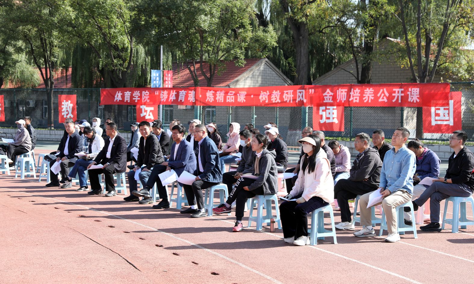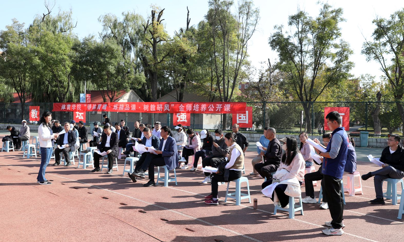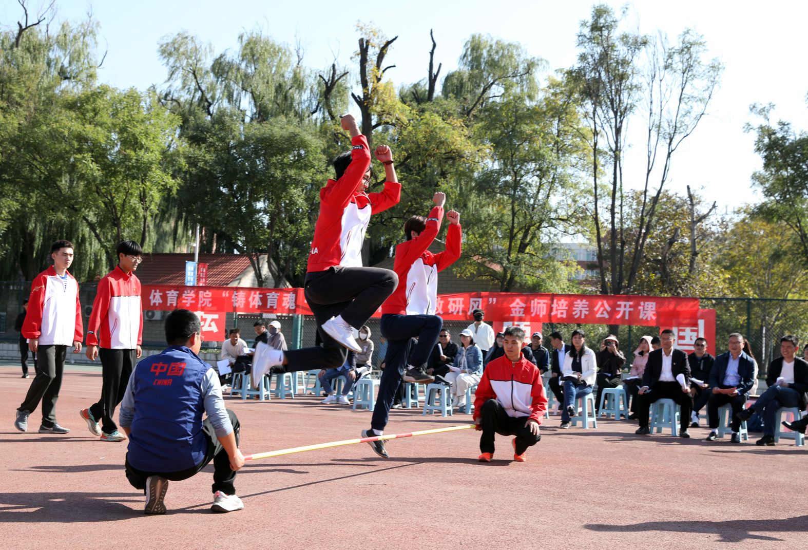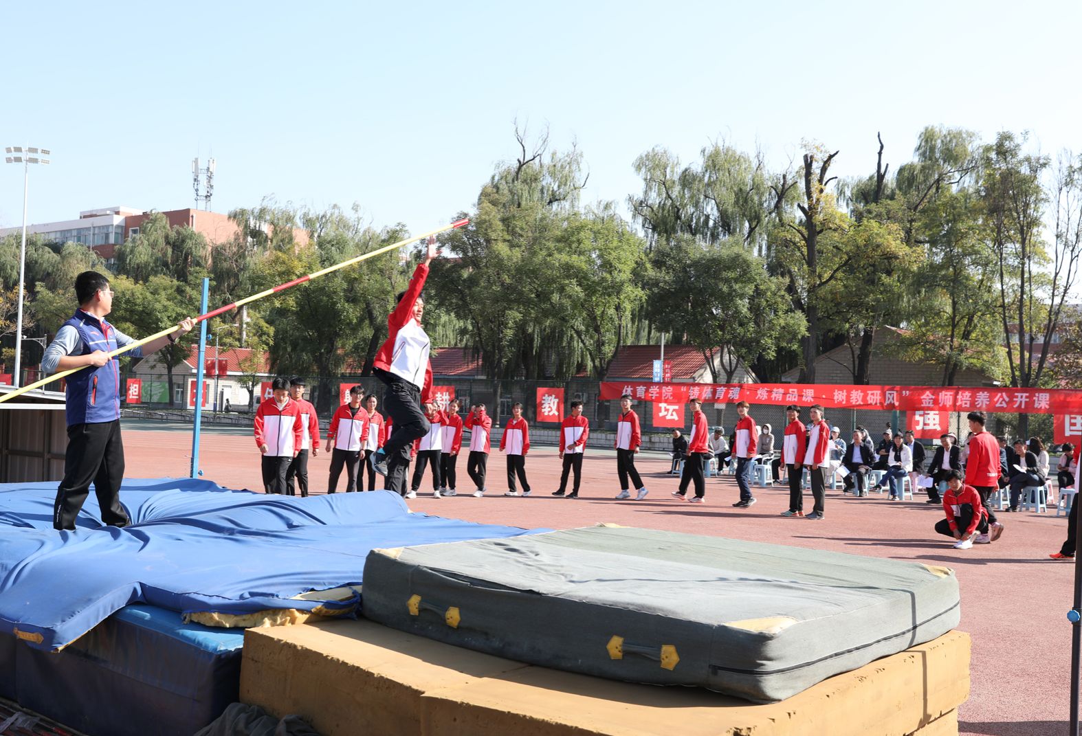 7790cnm必发集团“铸体育魂・炼精品课・树教研风” 系列第三阶段“凝新聚力共打磨・教学新秀促成长”于2024年10月11日14:00在田径场举行。此次公开课授课教师为体育教育系刘琦老师,授课内容为《背越式跳高起跳技术》,我校教学督导委员会委员张海珠教授、7790cnm必发集团领导、全体教师、部分学生齐聚田径场观摩了此次公开课,此次公开课由7790cnm必发集团副院长李向前主持。