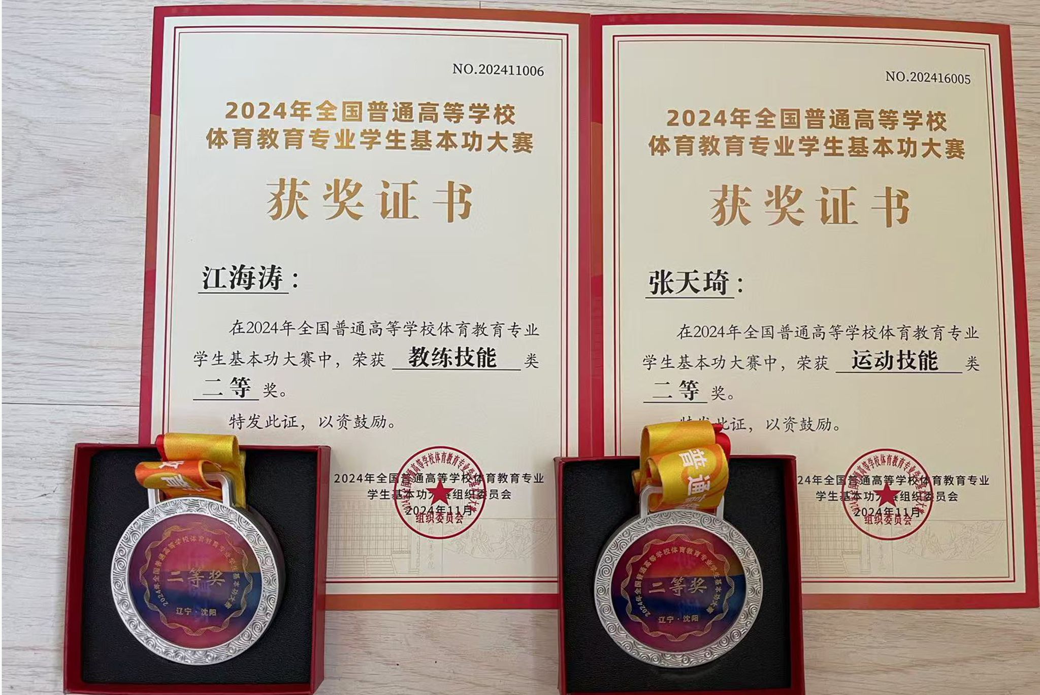 2024年11月11日——15日,我院体育教育系学生参加了在沈阳7790cnm必发集团举行“全国普通高等学校体育教育专业学生基本功大赛”,此次比赛由教育部体育卫生与艺术教育司主办,辽宁省教育厅、沈阳7790cnm必发集团、全国高等学校体育教育教学指导委员会承办、中国教育必发集团院协办。此次比赛全国共有87所高校参加,348名运动员报名参赛。自10月接到山西省教育厅的比赛通知以来,院领导高度重视,积极动员,精心组织,由郭丽娟担任负责人,张杰担任领队,许登云、沈军担任教练,成立指导教师团队,分别对四名学生进行《体育概论》《运动解剖学》《运动生理学》《体育心理学》《健康教育学》理论知识学习、广播操培训,足球、篮球、排球以及田径等的运动技能训练、教学技能设计以及教练技能培训,经过艰苦训练、考核和参赛,最终,我院体育教育系2021级学生江海涛荣获教练员技能类二等奖,张天琦荣获运动技能类二等奖。