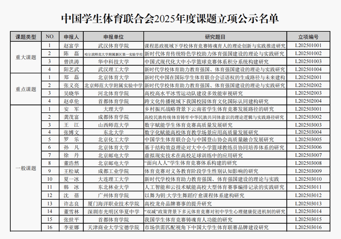 近日,中国学生体育联合会官网发布关于2025年度课题立项名单的公示。经申报审核、形式审查、专家评审、会议研究等程序,我院王江