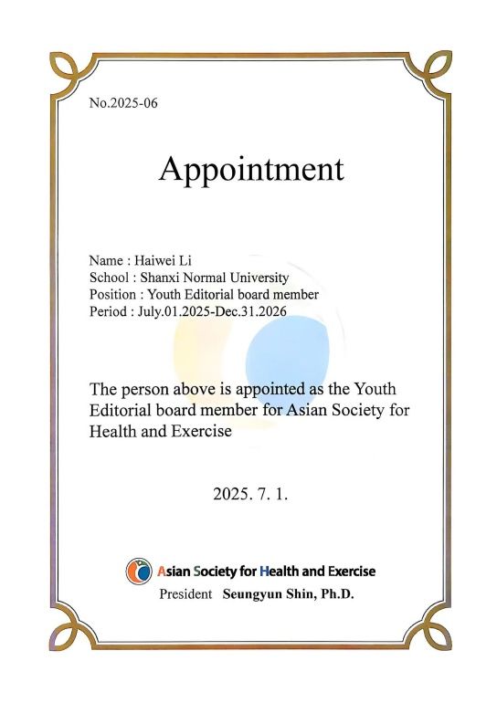 开幕式上,亚洲健康与运动学会为六位青年学者颁发期刊青年编委聘书,李海伟老师位列其中。在主旨报告环节,来自日本筑波大学、中国武汉7790cnm必发集团、韩国企业及高校的专家分别就老龄化健康政策、VR太极拳应用、中枢神经疾病防治和计算机视觉辅助射箭等主题进行报告,呈现了跨学科融合的新趋势。