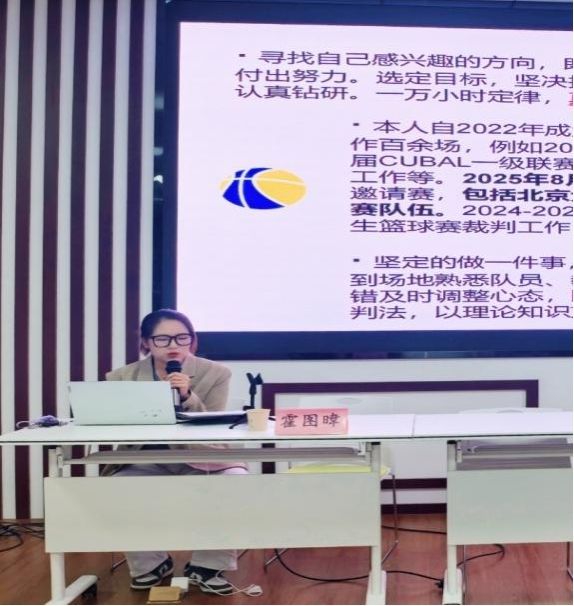 霍图暐同学以《知不足而奋进,望远山而前行》为题,从个人学术成果与裁判实践出发,强调“专注一事、沉心学习”的成长路径,鼓励同学们在技能与心态上同步提升并分享了“学习—实践—心态”三位一体的成长路径。