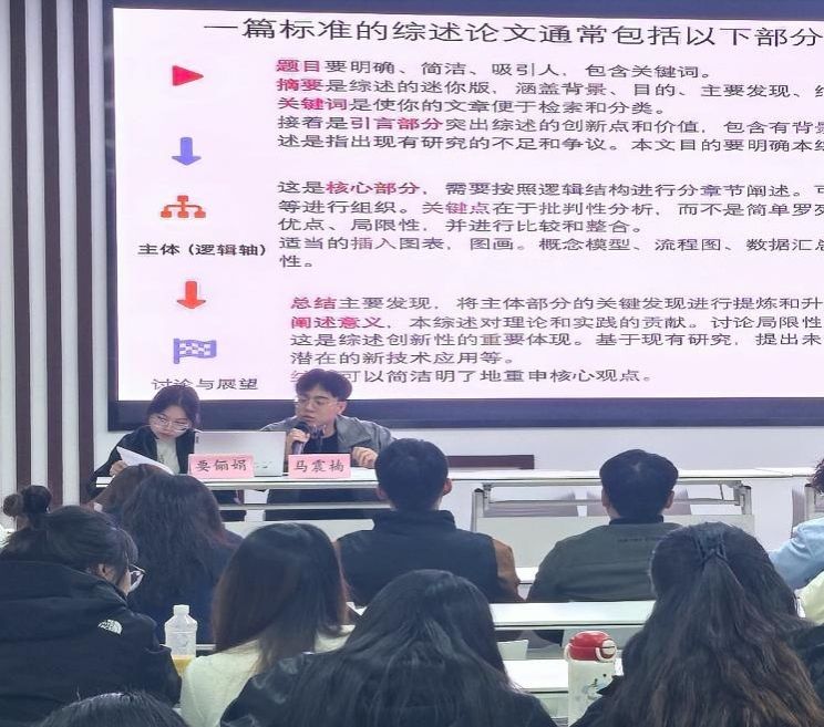 最后,马震南与要俪娟同学以《从选题到见刊:综述论文全攻略》为题,共同分享了综述论文的写作路径。他们指出,综述不仅是知识的整合,更是思维能力的锻炼。通过“四维筛选模型”(热点性、创新性、交叉性、可行性)锁定选题,结合Zotero等工具高效管理文献,构建逻辑清晰的文章架构,并强调了小组合作在分工撰写、思维碰撞中的重要作用。