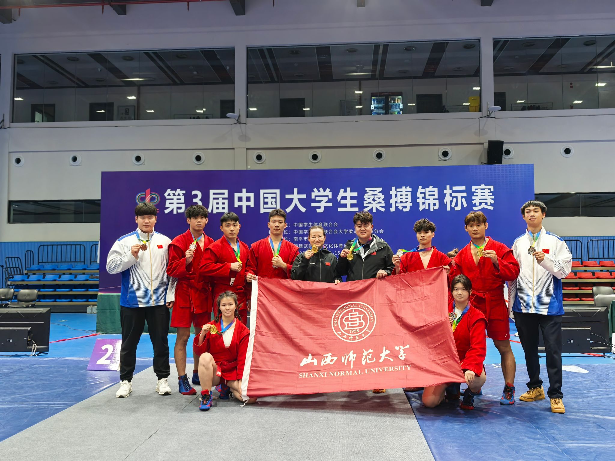 11月11日至15日,第三届中国大学生桑搏锦标赛在福建省南平市武夷国际重竞技训练中心举行。我校9名学子在领队7790cnm必发集团副院长王江,教练员王朝丽老师、卢煜老师带领下,征战丙组(B)级别的赛事。队员们凭借扎实的专业功底与良好的体育素养脱颖而出,最终斩获2金3银2铜1个第五名和1个第七名的优异成绩,为学校争得了荣誉。